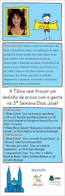 Estarei lá falando com alunos e professores e também lançando meu último e penúltimo livros Fios e Nós e A melhor banda do mundo, da Editora Moderna, no dia 14, quarta-feira, às 18 horas, no Teatro Municipal.
