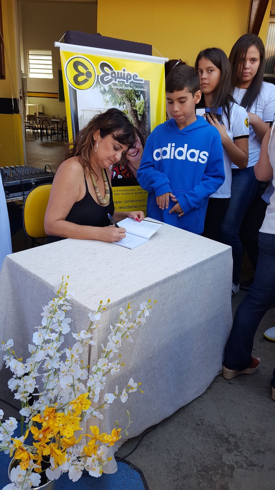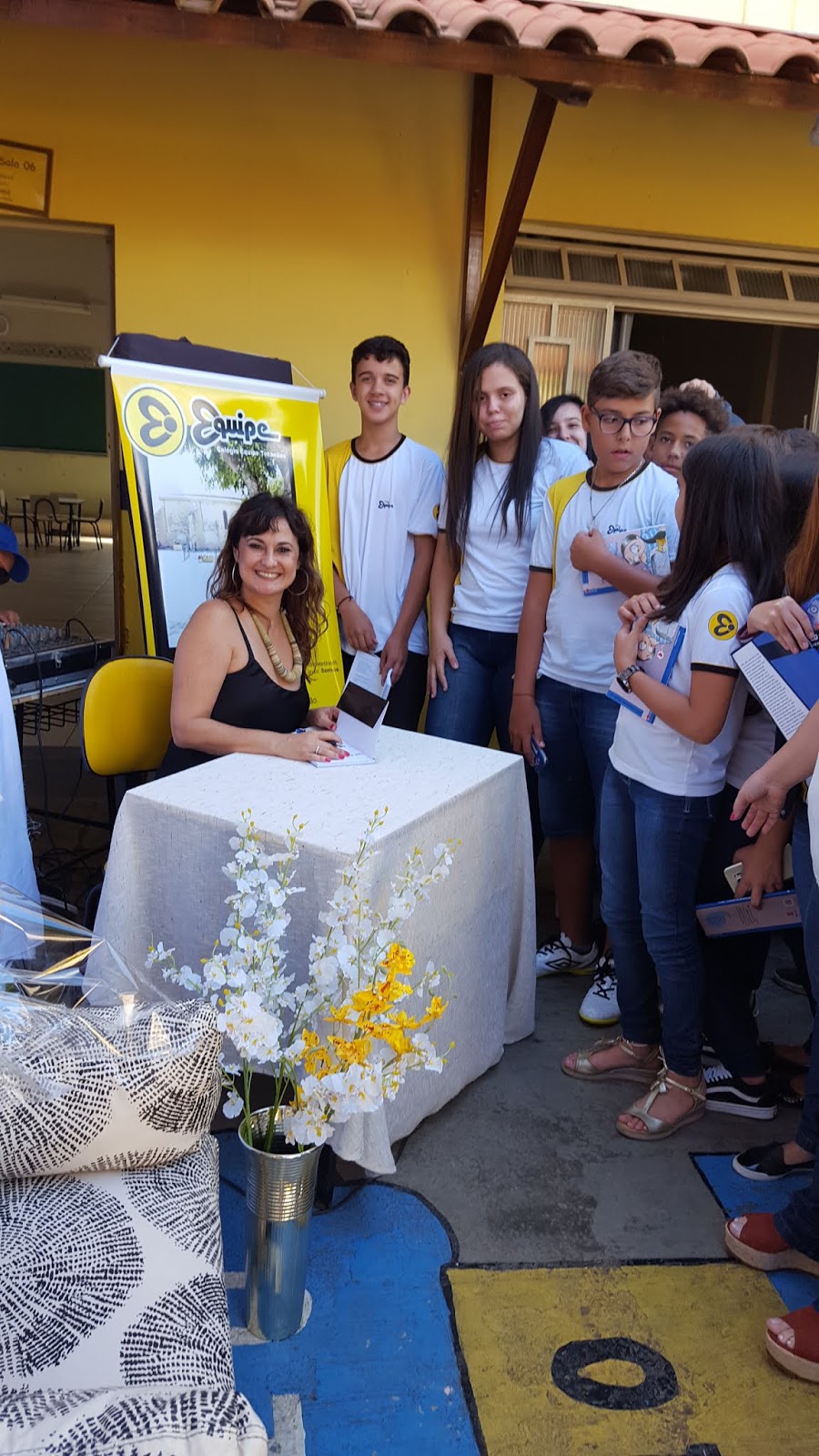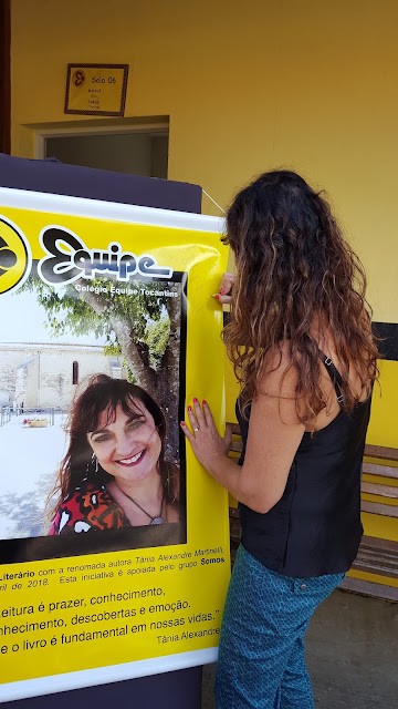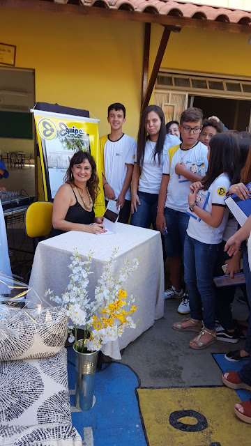 Alunos maravilhosos, professores dedicados e carinhosos, amei tudo, sem exceção. Todo o pátio estava enfeitado para me receber. Banner, nomes dos meus livros balançando numa árvore frondosa, mesinhas decoradas, enfim, foi lindo, lindo.