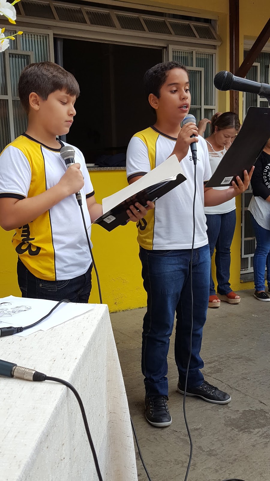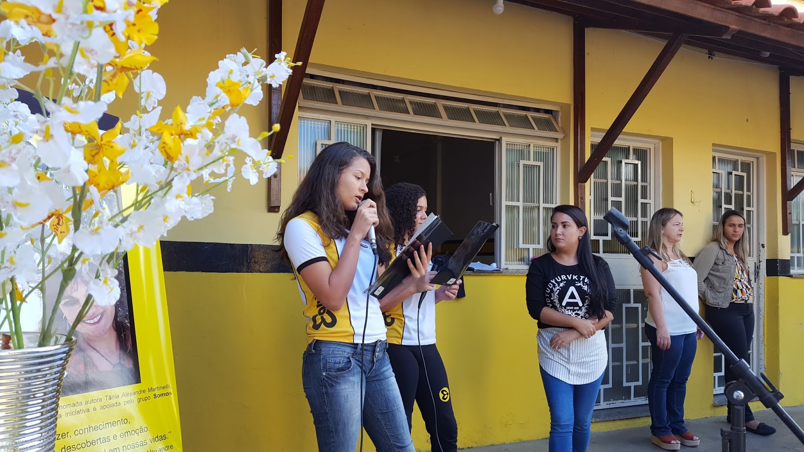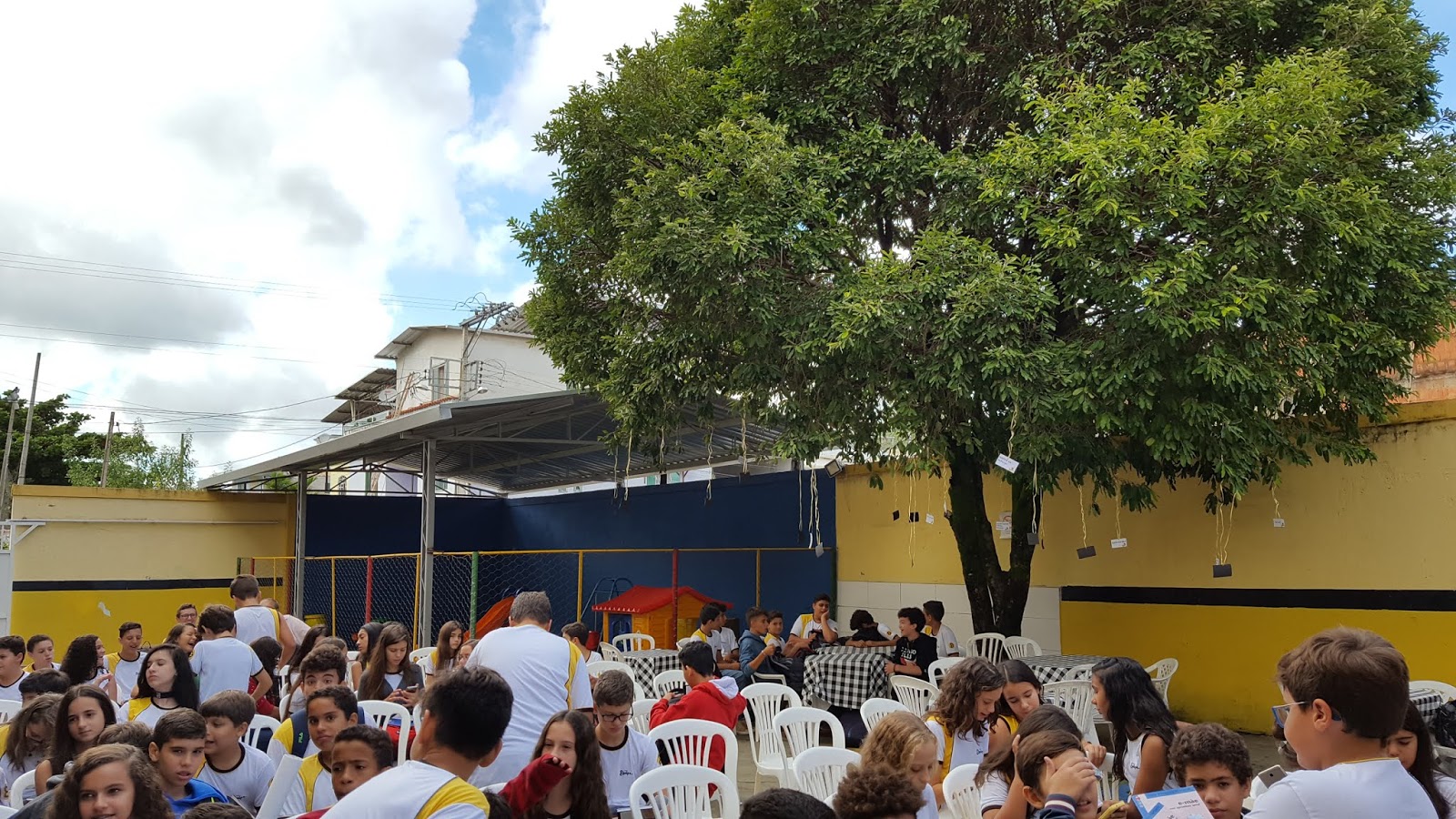 Alunos maravilhosos, professores dedicados e carinhosos, amei tudo, sem exceção. Todo o pátio estava enfeitado para me receber. Banner, nomes dos meus livros balançando numa árvore frondosa, mesinhas decoradas, enfim, foi lindo, lindo.