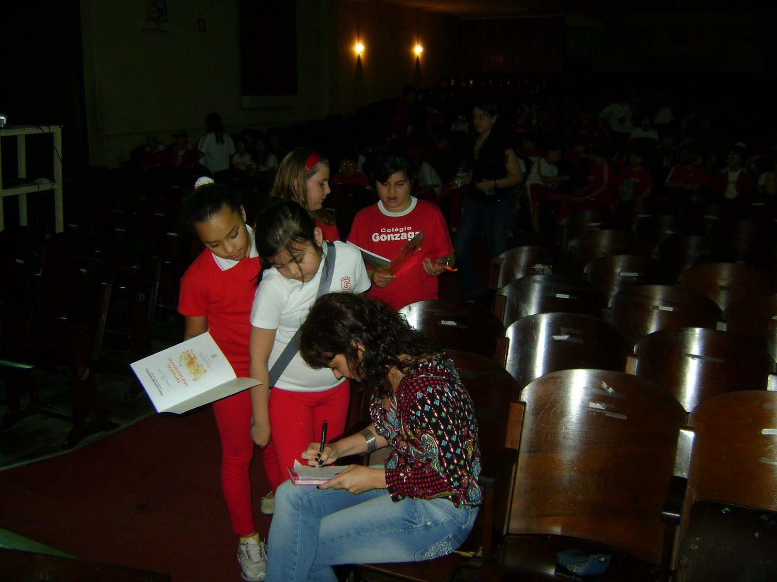 O Colégio Gonzaga trabalhou vários livros meus com seus alunos: Quero ser belo, Debaixo da ingazeira da praça, Rio vivo rio morto e Princesas são diferentes. Todas as turmas me receberam com muita alegria. Na foto abaixo, uma dessas turmas, eu e a professora Arinda.