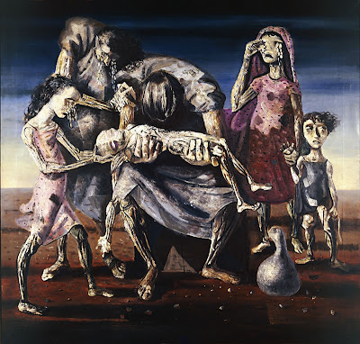 Notem as lágrimas que escorrem exageradas nos rostos. A cor do quadro, a dor e o sofrimento escapando da tela.